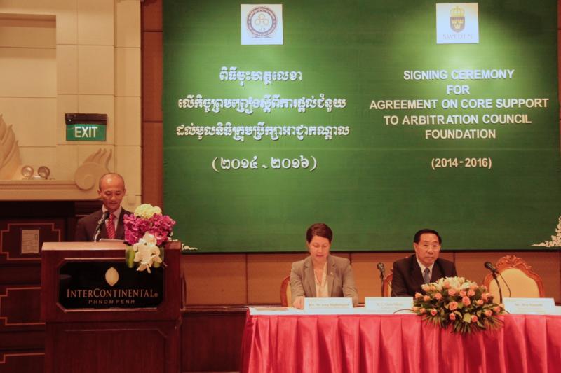 (From left to right ) Ms. Anna Maj Hultgard, H.E. Oum Mean - Secretary of State of Ministry of Labour and Vocational Training, and Mr. Men Nimmith stood up for national anthem of Cambodia